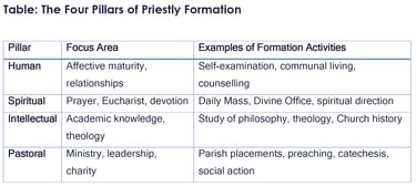 Each pillar, as outlined above, supports and is integrated with the others. Growth in one area reinforces growth in the others, and all are necessary to form a mature, credible, and effective priest.